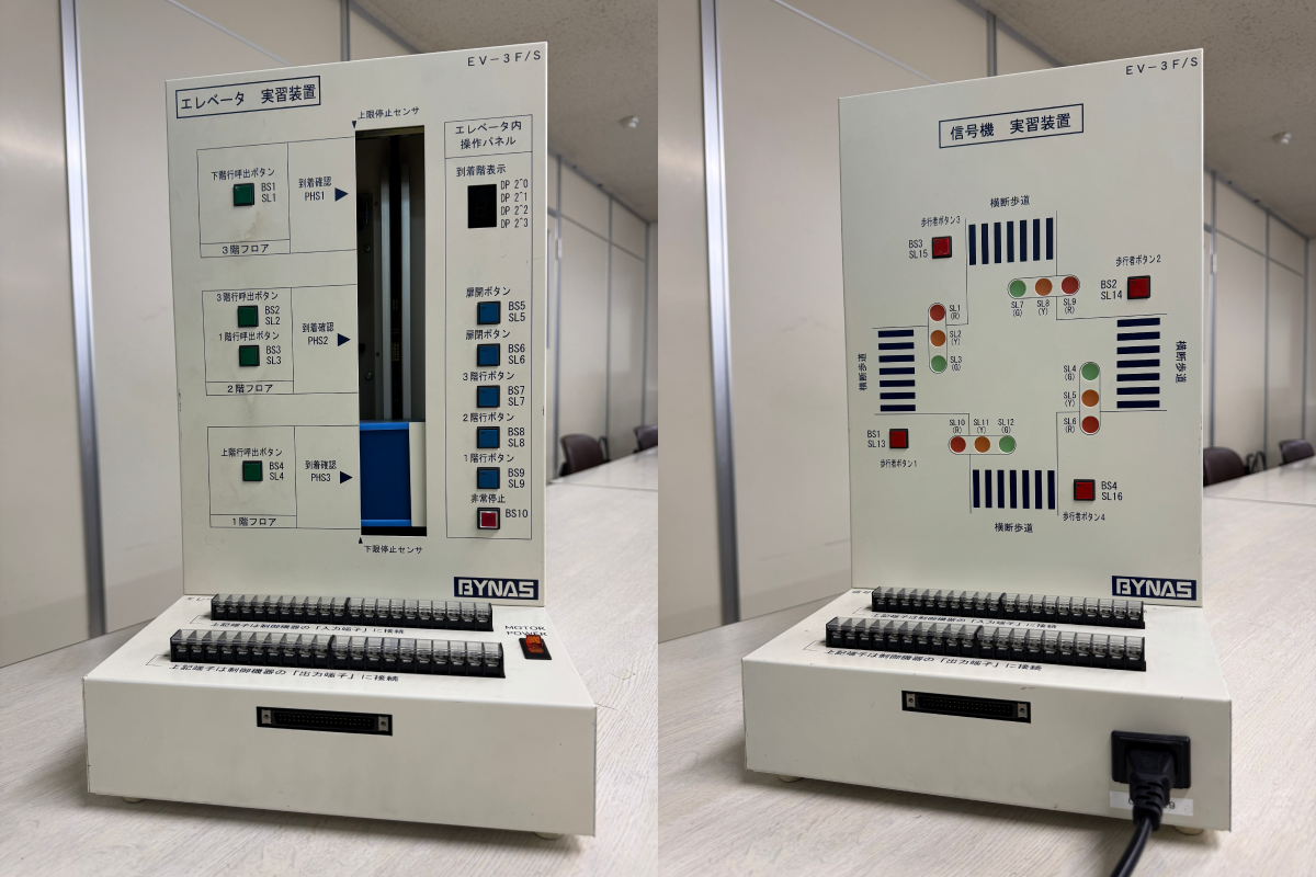 PLCという機械を自動的に制御する装置を用いて、エレベーターや交通信号、コンベアなどを制御するプログラミング技術を学びます。